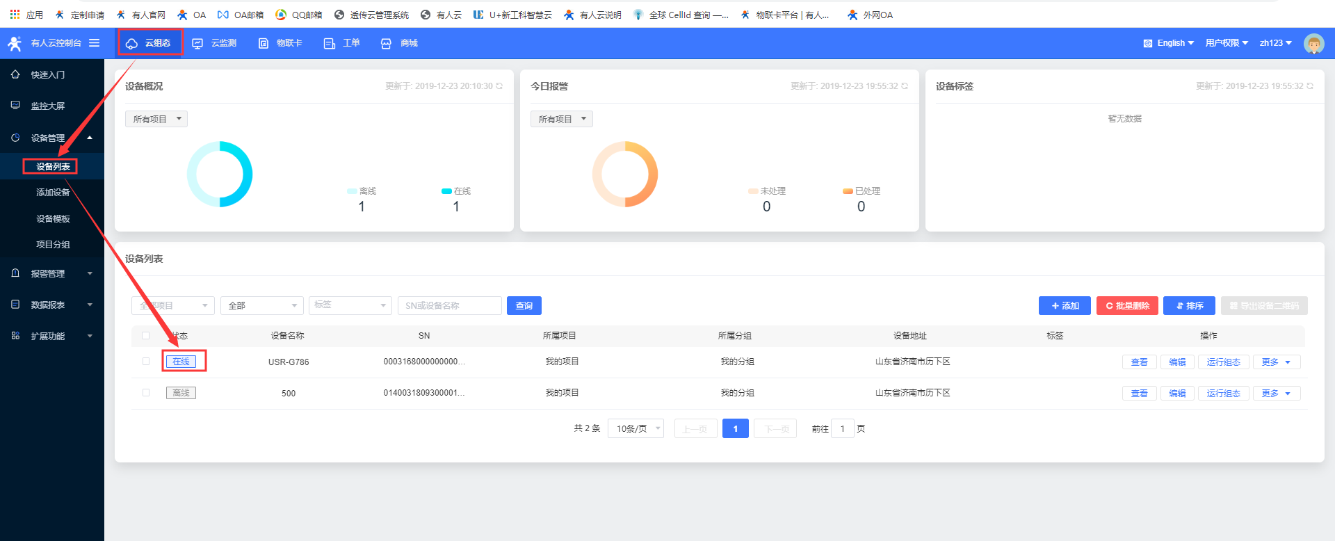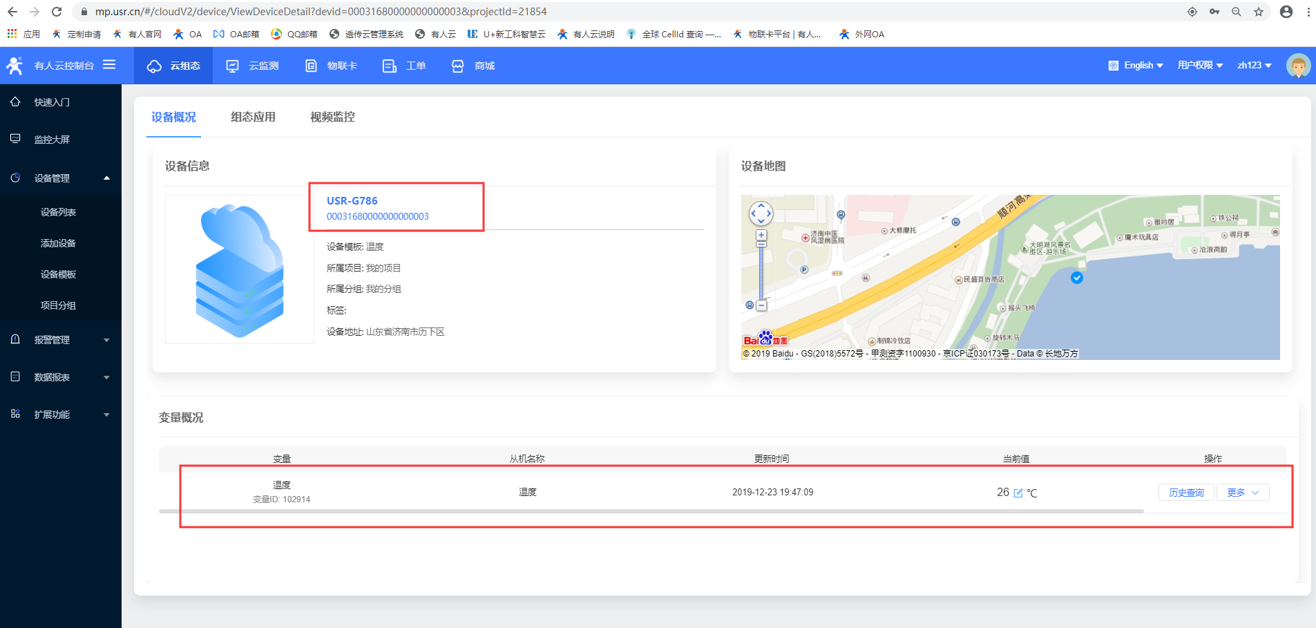14、等待設(shè)備重啟以后,在有人云界面就可以看到USR-G786上線(xiàn);