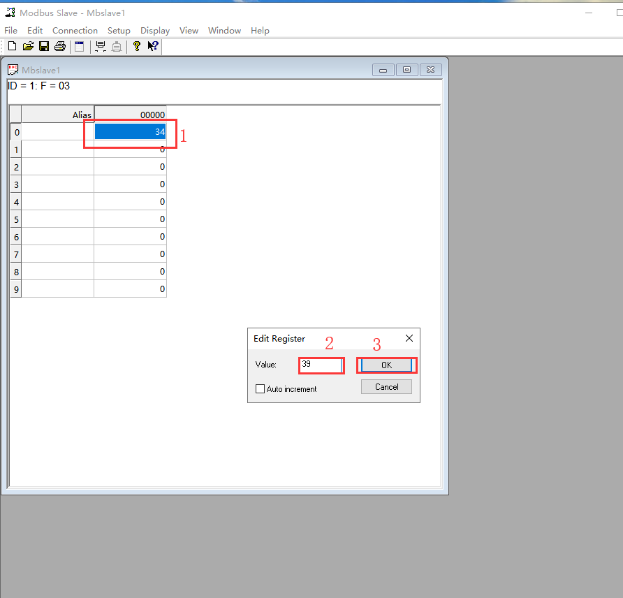 17、在Modbus Slave文本框中輸入模擬的溫度數(shù)據(jù),點(diǎn)擊OK;