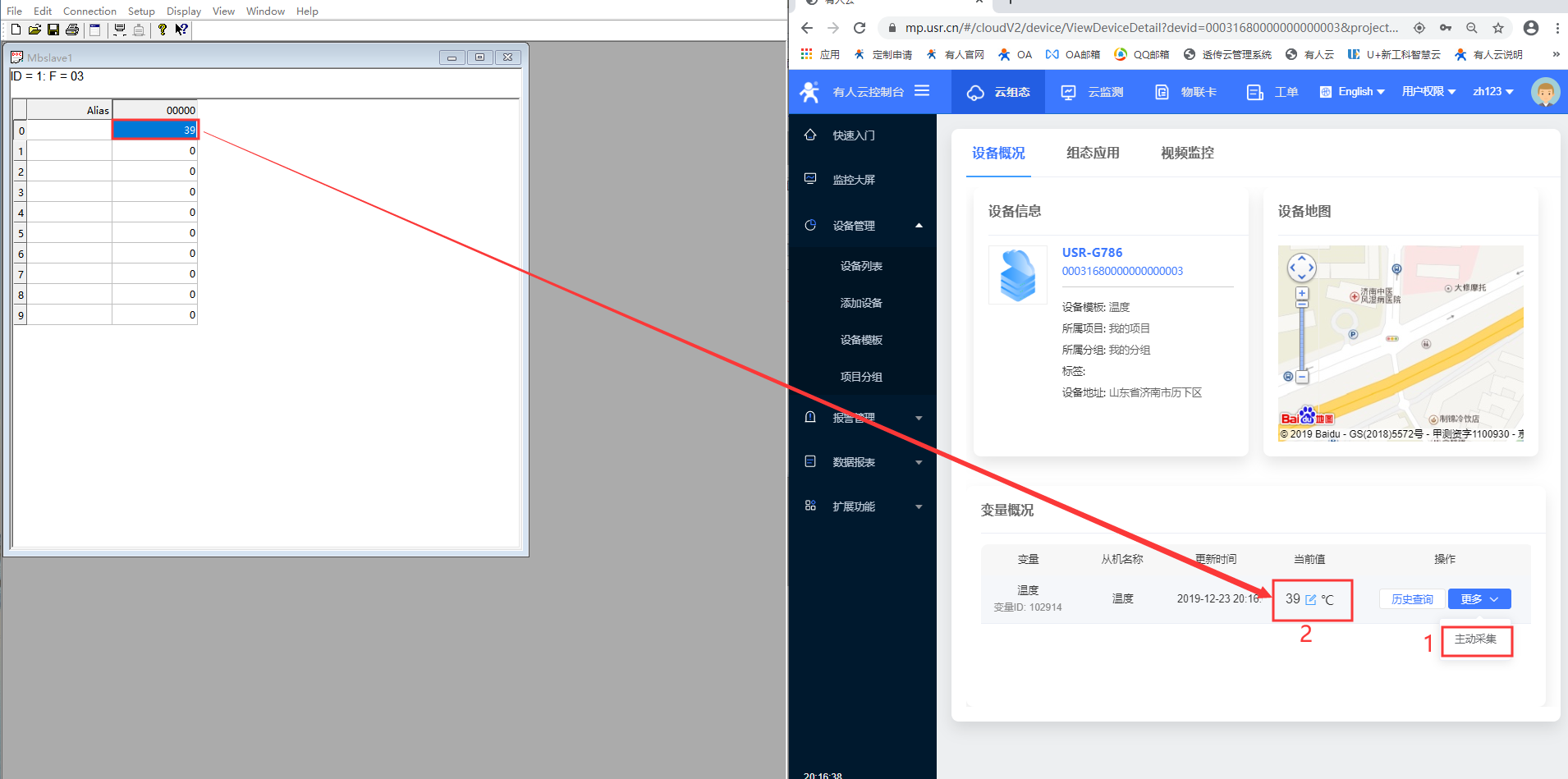 18、在有人云界面點(diǎn)擊主動(dòng)采集,即可立即采集到對(duì)應(yīng)的溫度數(shù)據(jù)(若設(shè)備模板設(shè)置主動(dòng)采集,則有人云會(huì)按照采集頻率主動(dòng)下發(fā)采集指令,本案例設(shè)置采集頻率為1分鐘);