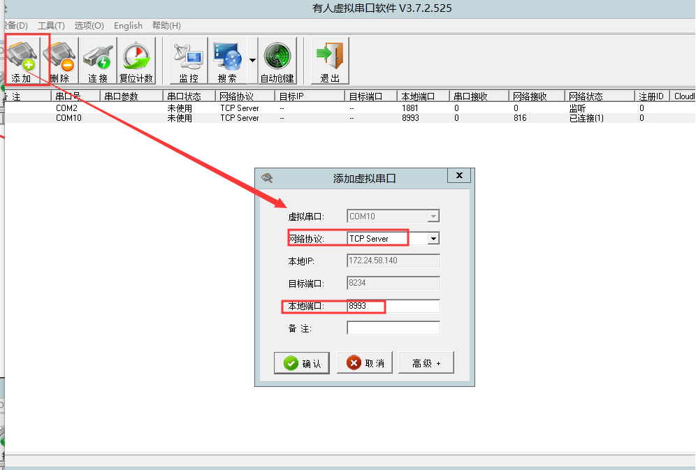 5. 安裝虛擬串口后,設(shè)置方法:添加虛擬串口-->選擇COM口-->TCP server(軟件會自動鎖定本地IP)-->設(shè)置本地端口號(和DTU設(shè)置的服務(wù)器端口號一致,本案例中是8993)-->確認(rèn)
