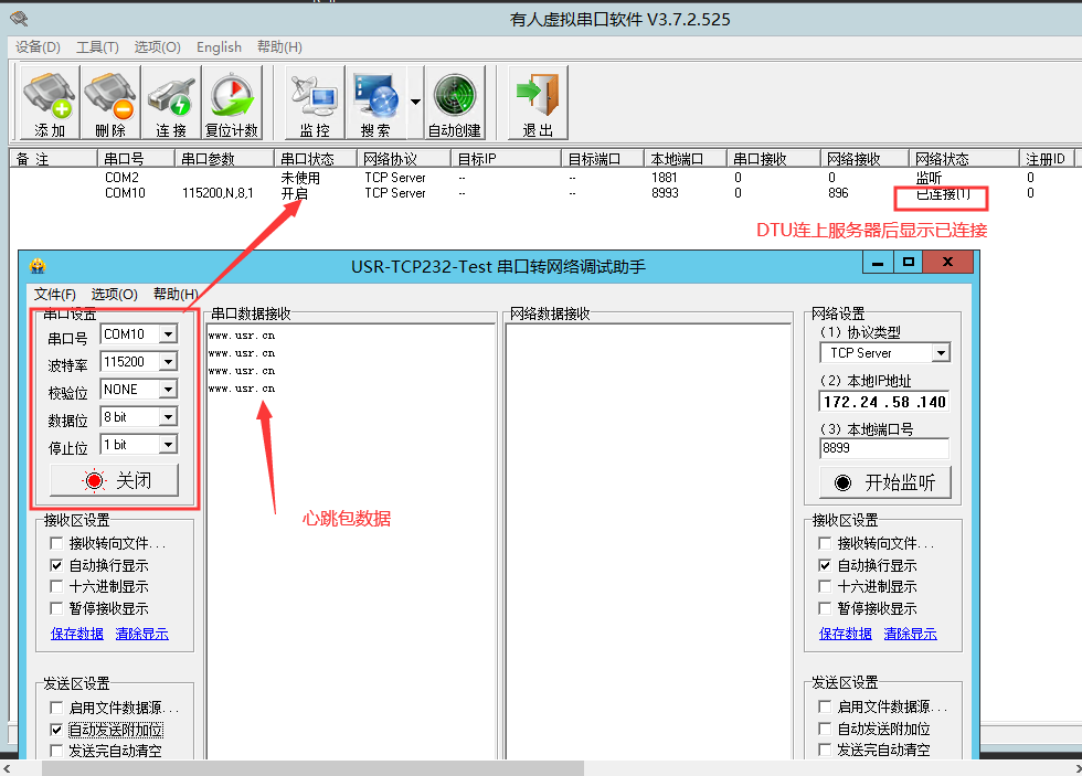 DTU串口和虛擬串口雙向數(shù)據(jù)收發(fā)結(jié)果見下圖