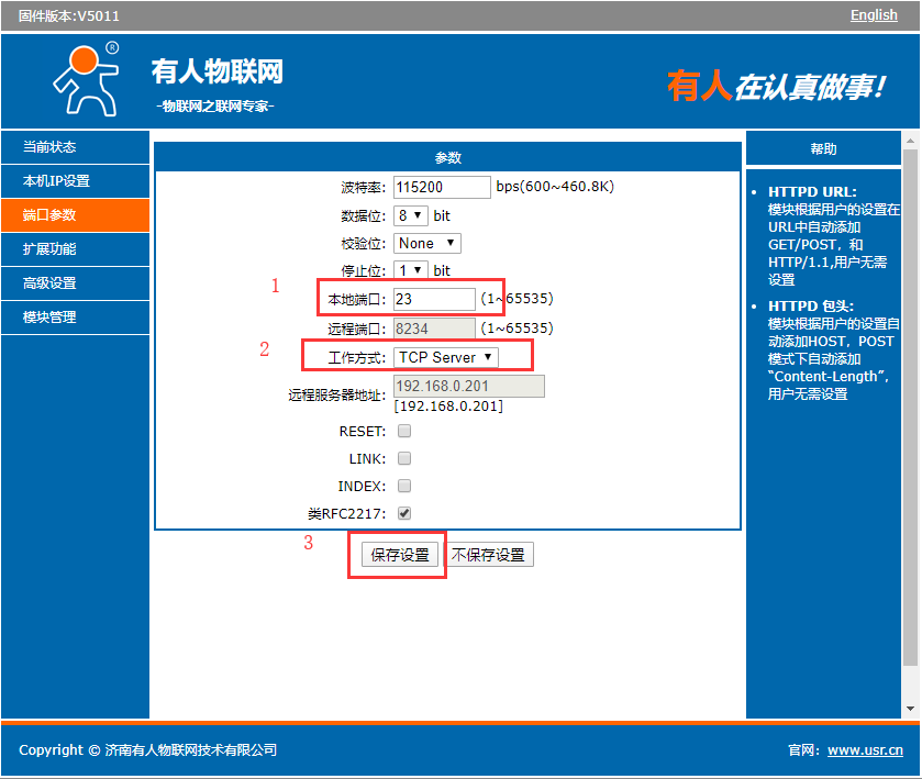 5、在“端口參數(shù)”設(shè)置處將301的工作模式設(shè)置成TCP-Server,本地端口23(端口可設(shè),此處以23為例),設(shè)置完成后保存參數(shù)。