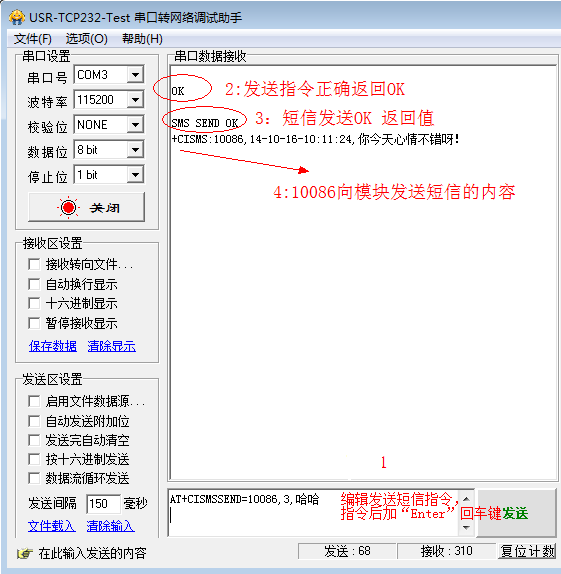 (2)串口助手發(fā)送短信,指令后回車換行鍵