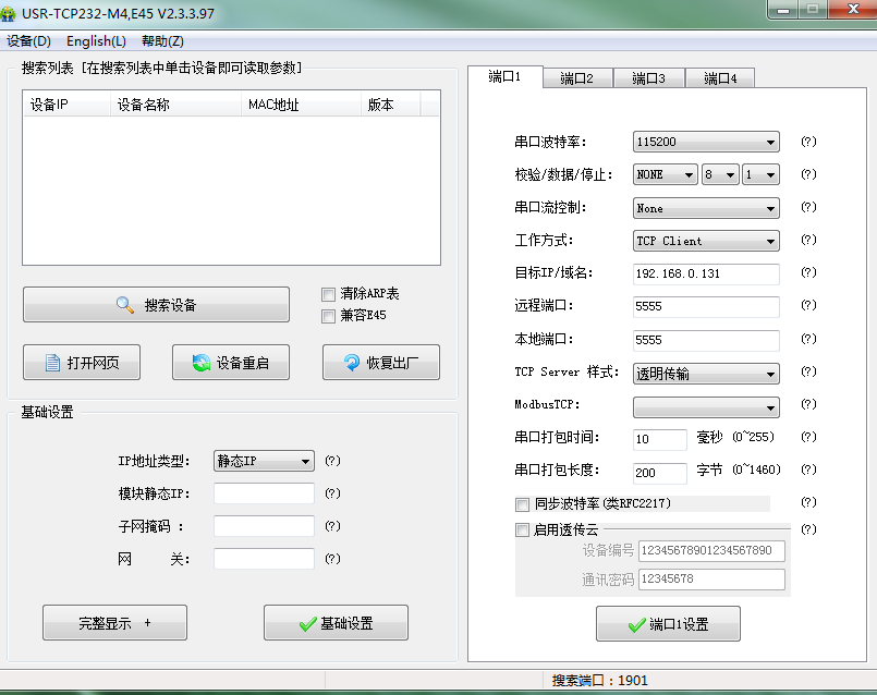 點(diǎn)擊“搜索設(shè)備”,當(dāng)搜索列表中出現(xiàn)410S的設(shè)備后,單擊搜索到的設(shè)備,查看其配置信息(下圖為默認(rèn)配置信息)。