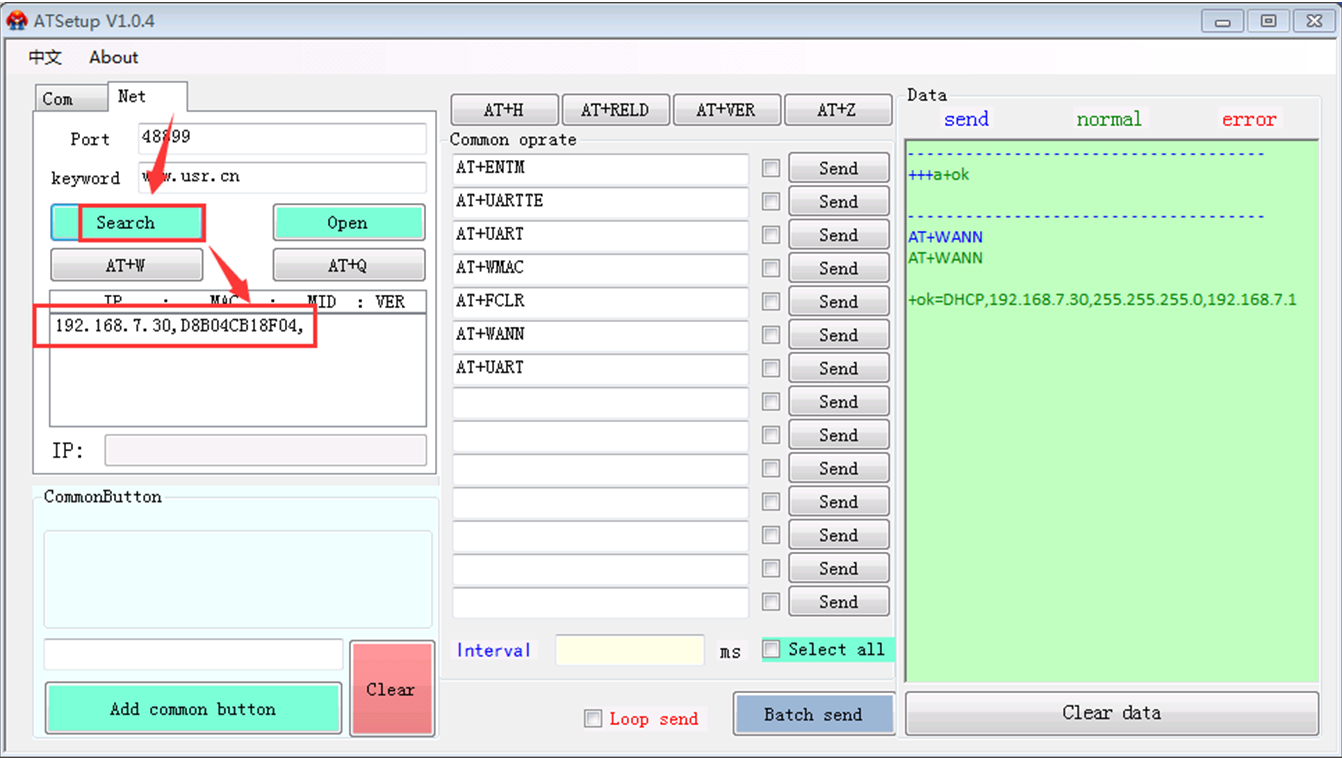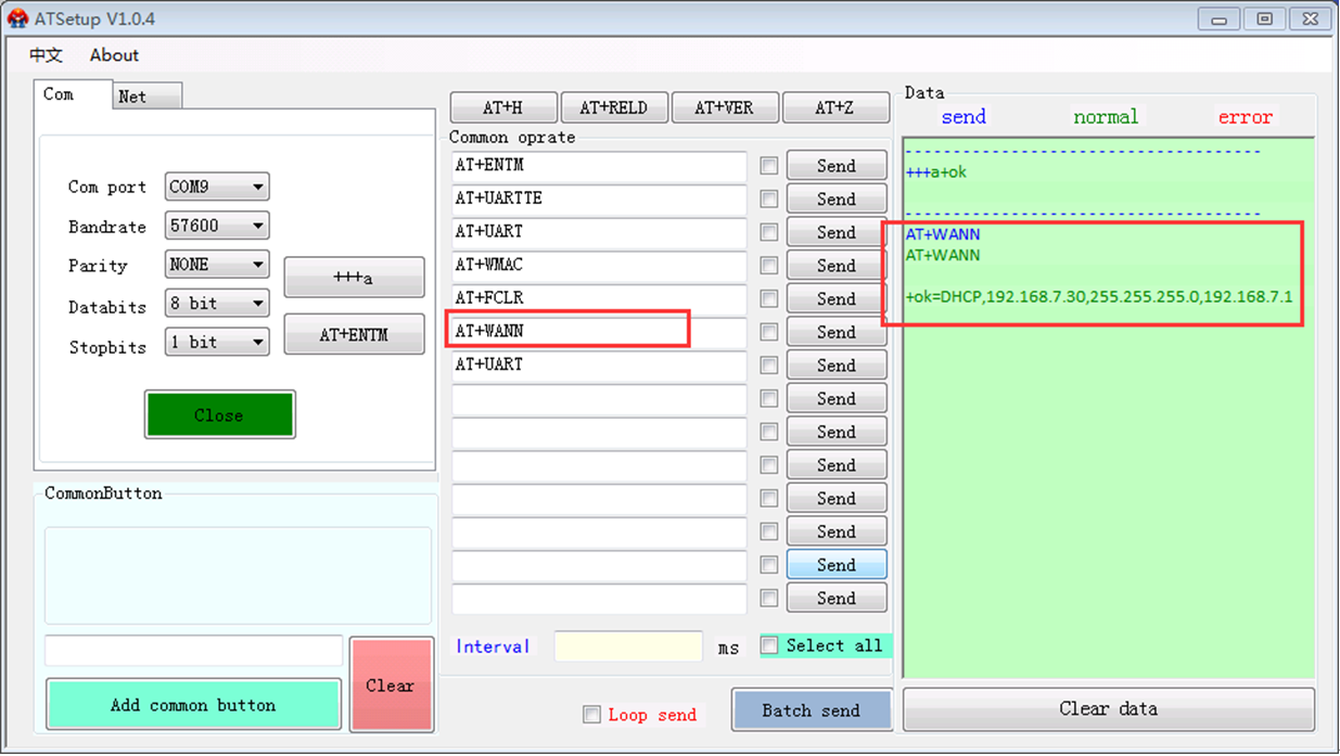 2>發(fā)送AT+WANN就可以查詢wifi模塊的WAN IP地址了;通過這個軟件也可以設(shè)置/查詢wifi模塊的其他參數(shù),全面的AT指令見相關(guān)產(chǎn)品的軟件設(shè)計手冊。