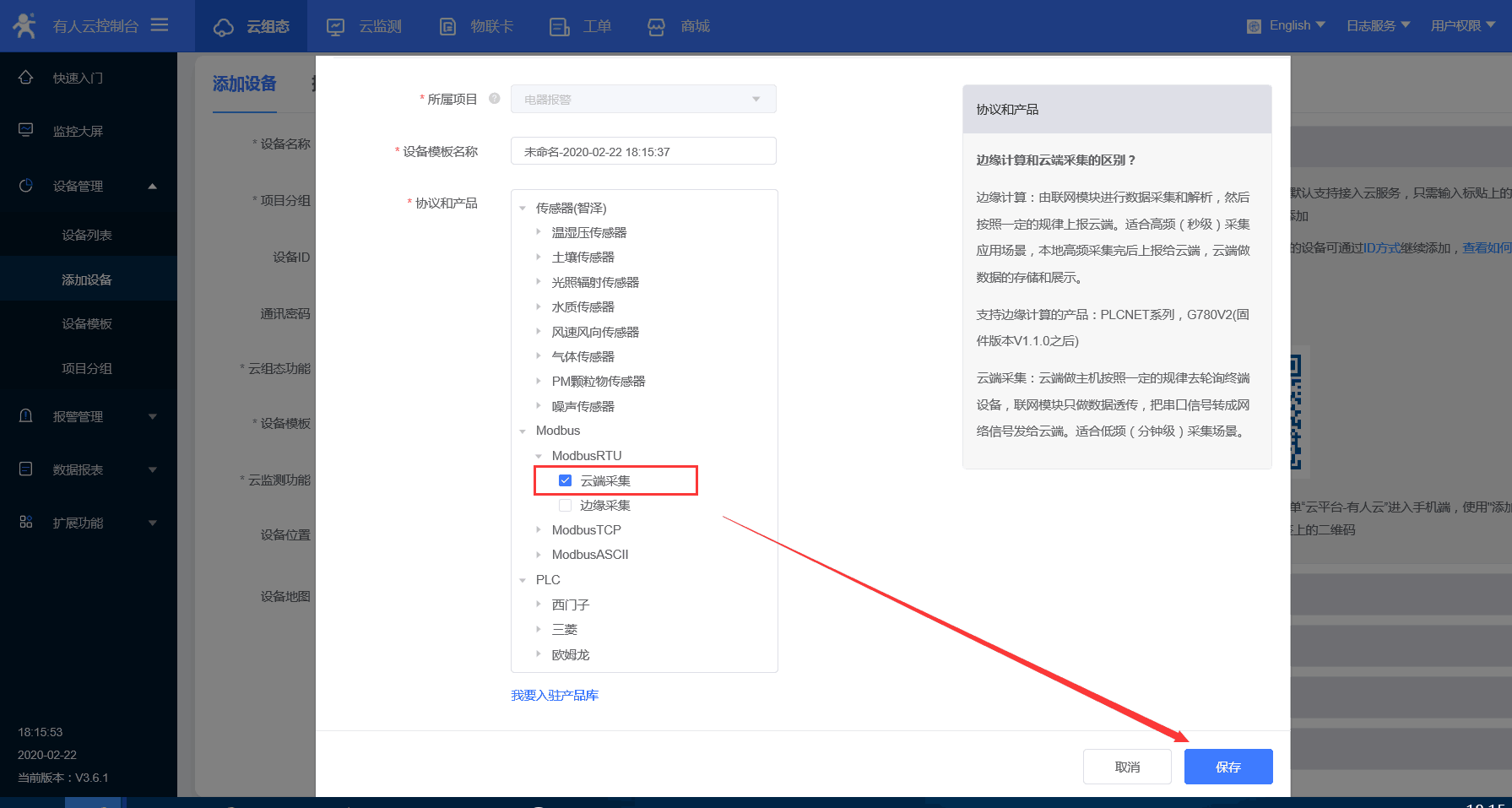 (1)點(diǎn)擊添加設(shè)備(有人云以ID方式添加)-->點(diǎn)擊添加模板-->Modbus-->Modbus RTU-->云端采集
