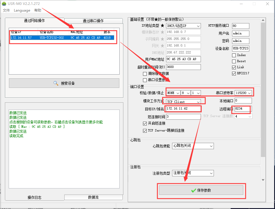 點(diǎn)擊“搜索設(shè)備”,當(dāng)搜索列表中出現(xiàn)302的設(shè)備后,單擊搜索到的設(shè)備,設(shè)置配置信息并保存