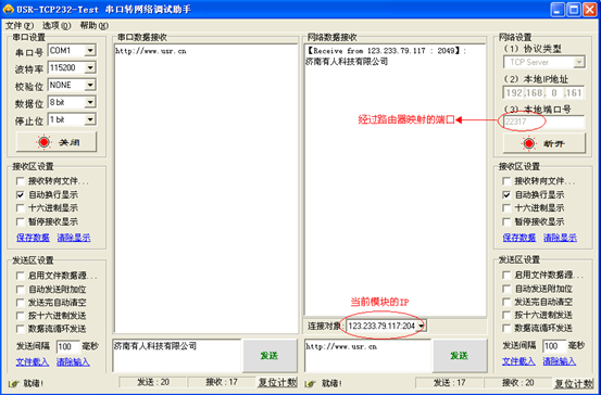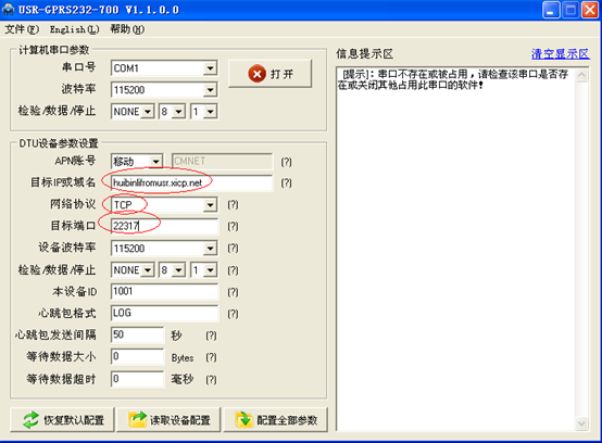設置目標IP及端口如下,第一個是USR-TCP232-E45以太網轉串口模塊,第二個是GPRS232-700,