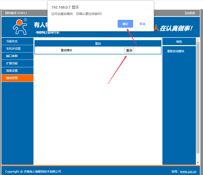 7、在“模塊管理”處重啟模塊。重啟成功之后會(huì)提示“重啟成功”。