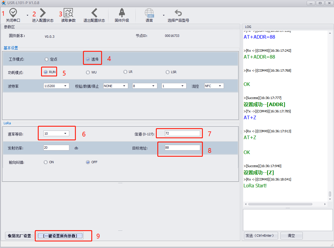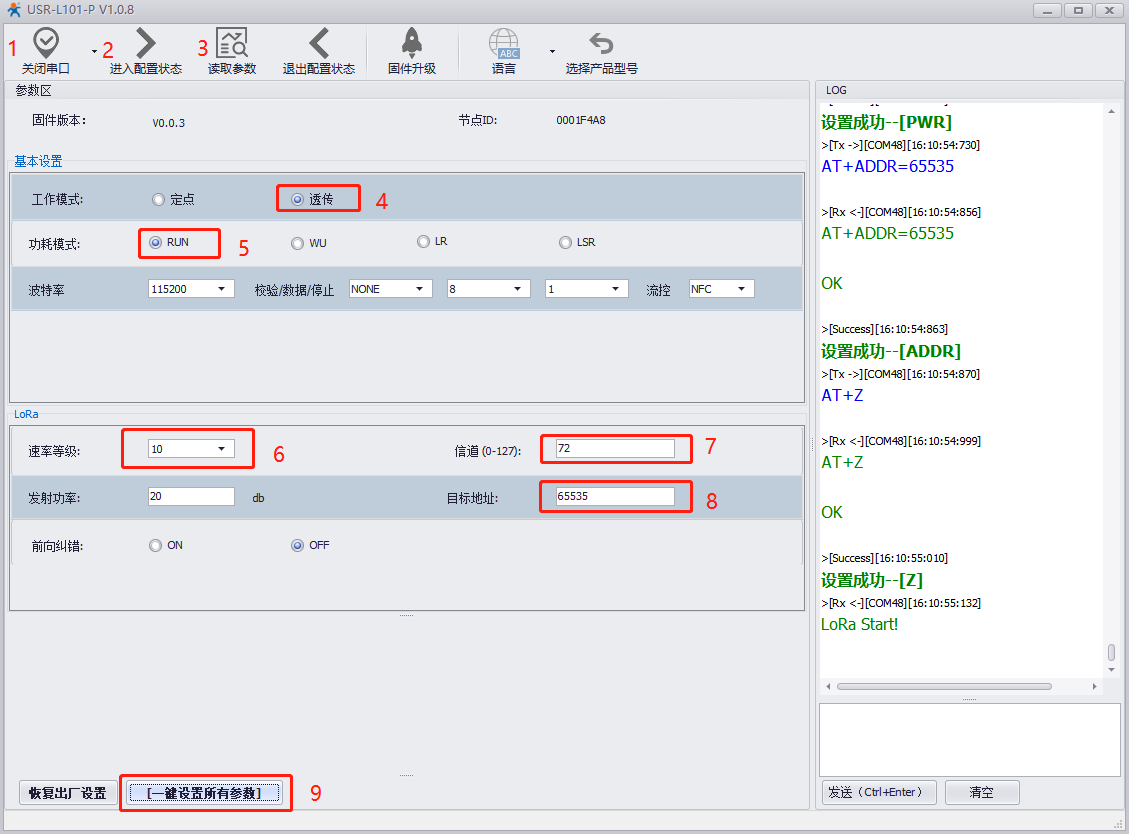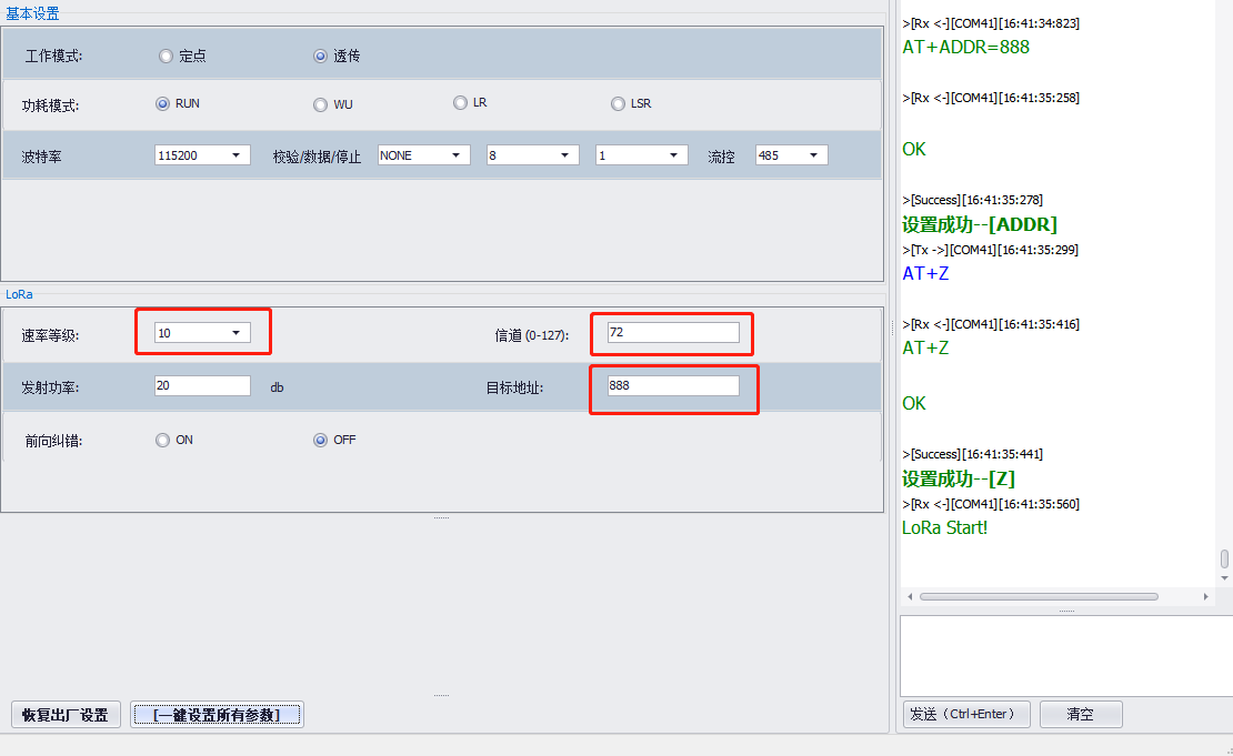 打開LoRa設(shè)置軟件(102-P設(shè)備選擇L101-P打開軟件),依次點(diǎn)擊打開串口(選擇A、B對應(yīng)的串口號,串口參數(shù):115200,None,8,1,NFC)、進(jìn)入配置狀態(tài)、讀取參數(shù)、配置上表中的參數(shù)、一鍵設(shè)置所有參數(shù),關(guān)閉LoRa設(shè)置軟件。