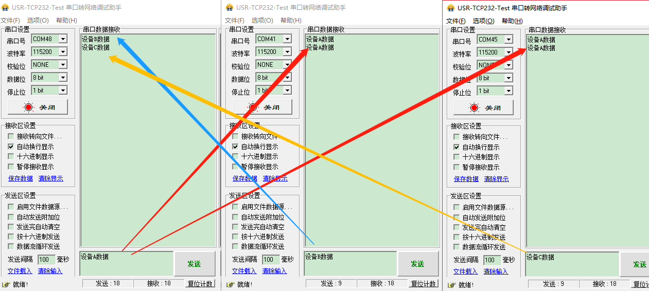 (3)啟動(dòng)三個(gè)USR-TCP232-Test(模擬串口設(shè)備1,2,3)分別連接LoRa數(shù)傳廣播端A、接收端B、C的串口,使用串口設(shè)備1發(fā)送數(shù)據(jù),串口設(shè)備2、3可接收數(shù)據(jù),設(shè)備2、3的數(shù)據(jù)可以發(fā)送給設(shè)備1,通信效果如下圖所示: