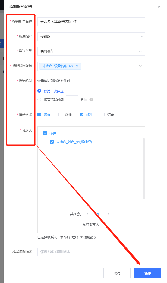 2、在彈出的對(duì)話框中,下拉框選擇需要報(bào)警通知的設(shè)備,選擇您需要的報(bào)警信息推送機(jī)制,報(bào)警方式及該報(bào)警的報(bào)警聯(lián)系人,填好對(duì)應(yīng)的信息后保存。