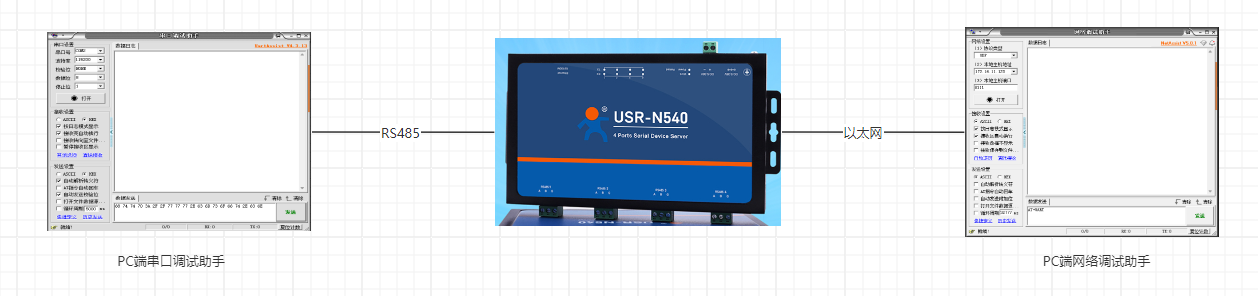 USR-N540-H7 的485串口1接USB-RS485串口線到電腦USB口,網(wǎng)口接網(wǎng)線直連電腦,然后產(chǎn)品接12V電源適配器上電。