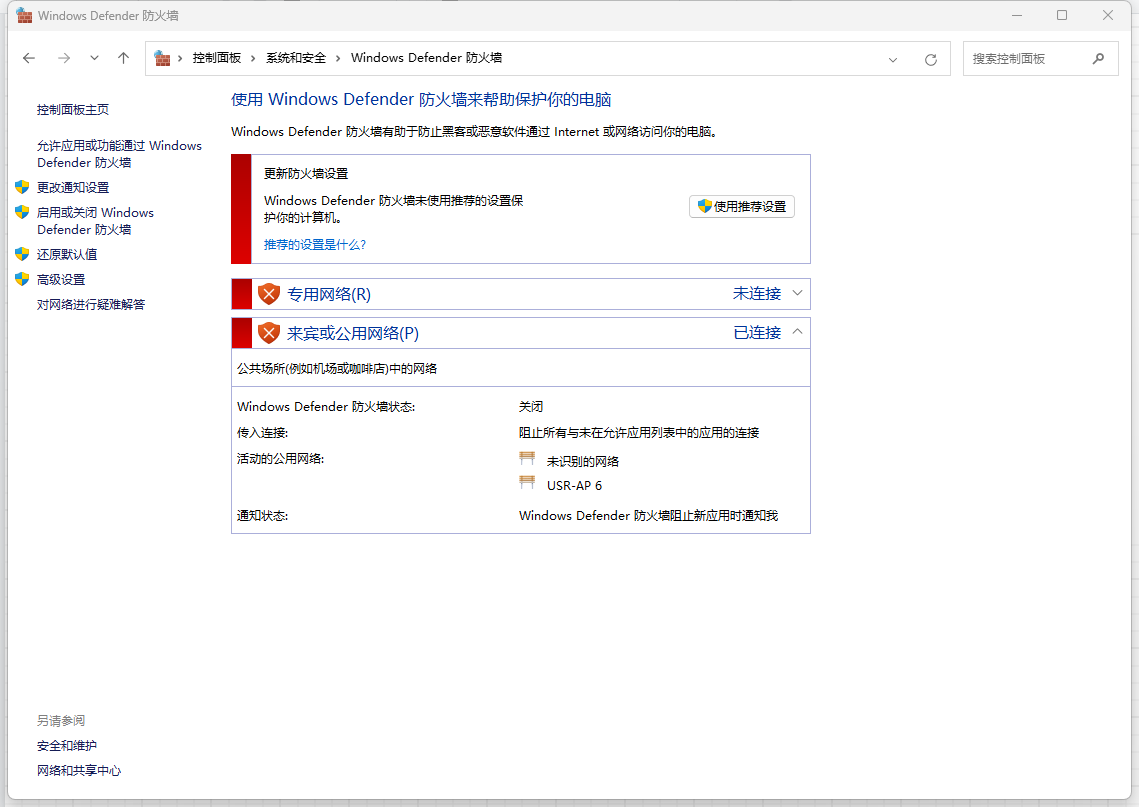 控制面板---系統(tǒng)和安全---Windows Defnder防火墻,關(guān)閉防火墻