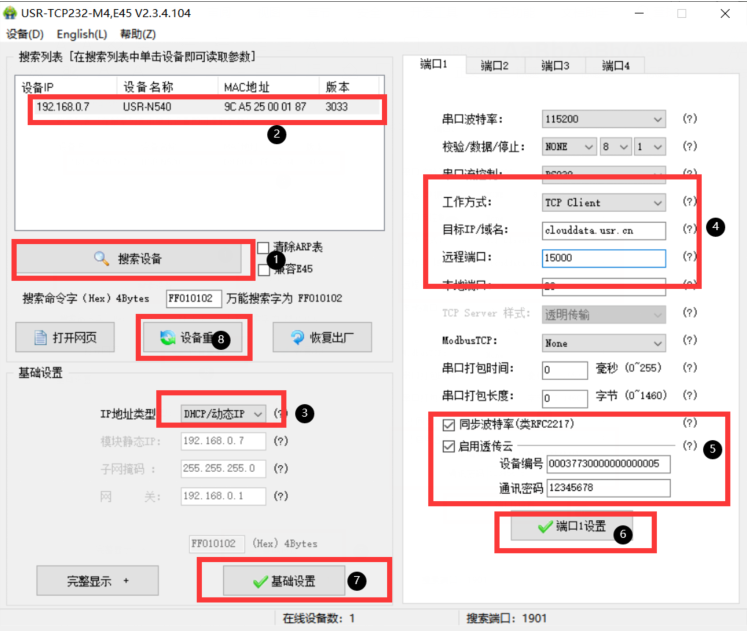 1. 設(shè)置N540參數(shù),將網(wǎng)線與電腦直連,搜索設(shè)備,將ip改為動態(tài),模塊工作方式改為client,目標(biāo)地址為有人云地址clouddata.usr.cn,端口為15000