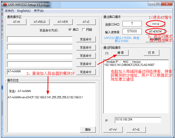 串口AT指令模式查詢(xún)模塊加入路由器之后自動(dòng)獲取的IP地址:查詢(xún)到模塊加入路由器的IP地址為192.168.0.141
