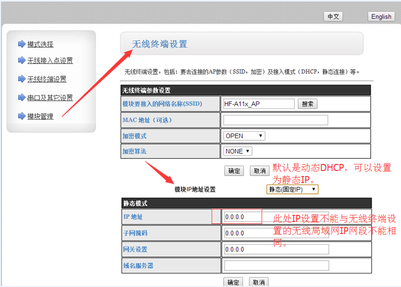 模塊無(wú)線(xiàn)終端設(shè)置的靜態(tài)IP必須和模塊連接的路由器IP一個(gè)網(wǎng)段。