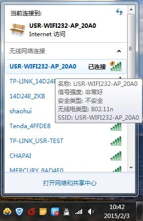 搜索網(wǎng)絡(luò),如下圖的USR-WIFI232-AP_XXXX即是模塊的默認(rèn)網(wǎng)絡(luò)名稱(chēng)(ssid)。