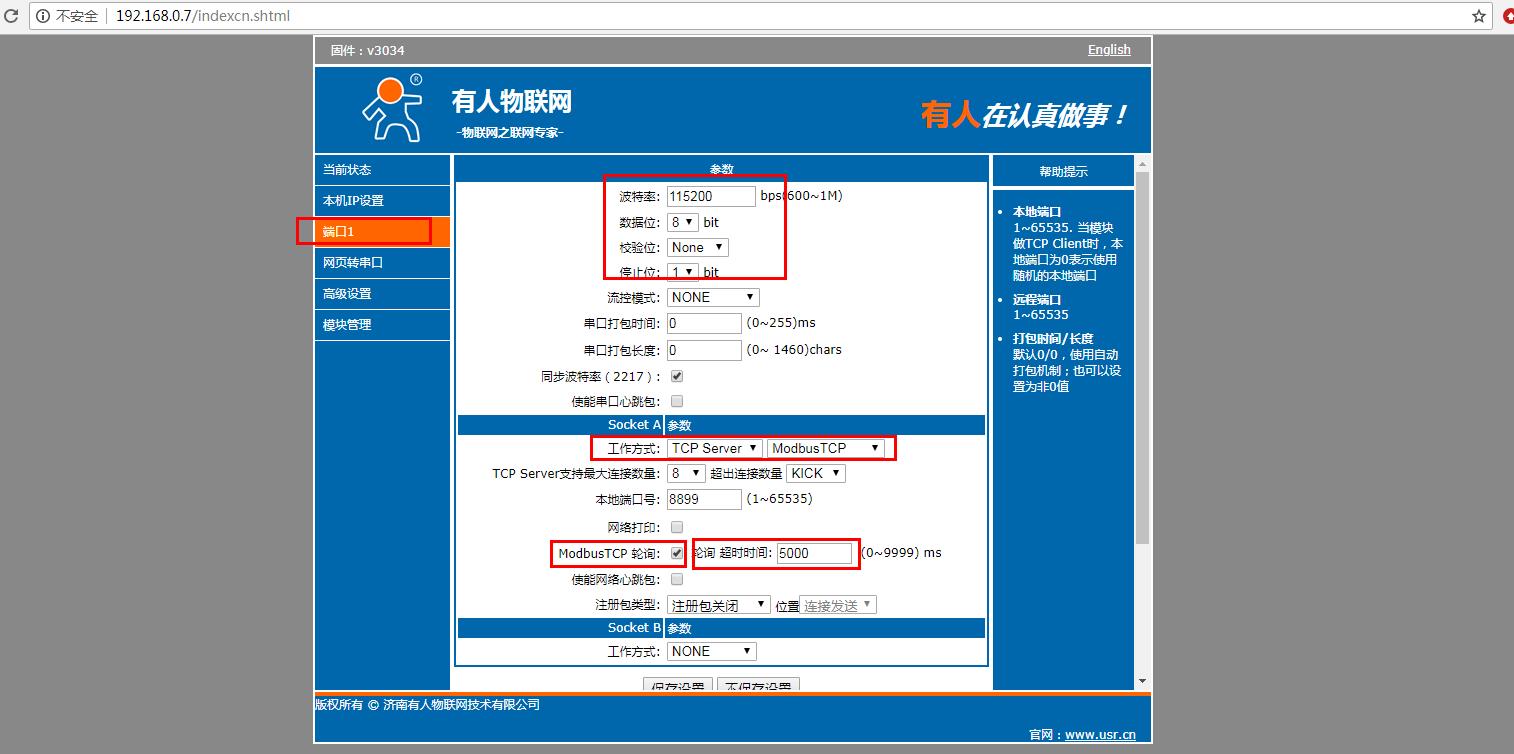 網(wǎng)頁檢查串口參數(shù),工作方式設(shè)置TCP serverModbusTCP,本地端口號默認(rèn)是8899,Modbus TCP輪詢默認(rèn)是關(guān)閉,需要勾選開啟MODBUS TCP輪詢。