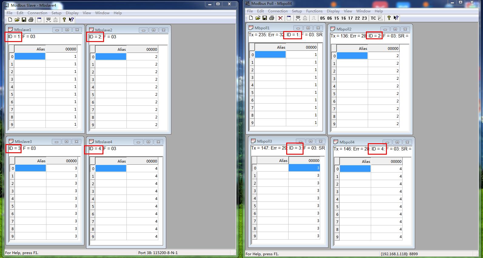 MODBUS POLL軟件對應(yīng)添加4個SLAVE ID,依次是ID 1 ID 2 ID 3 ID 4。