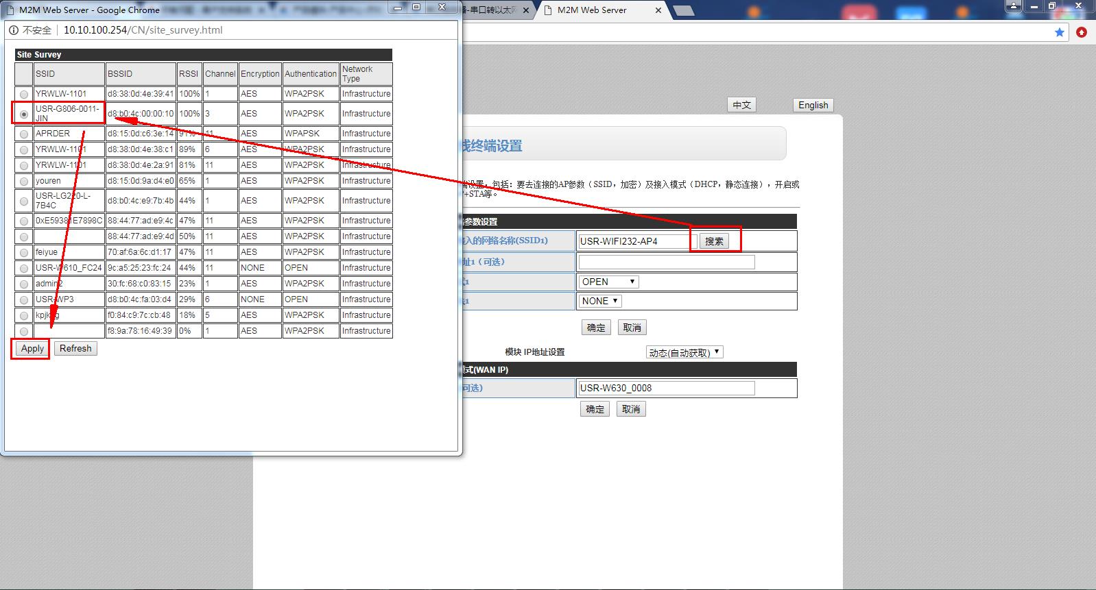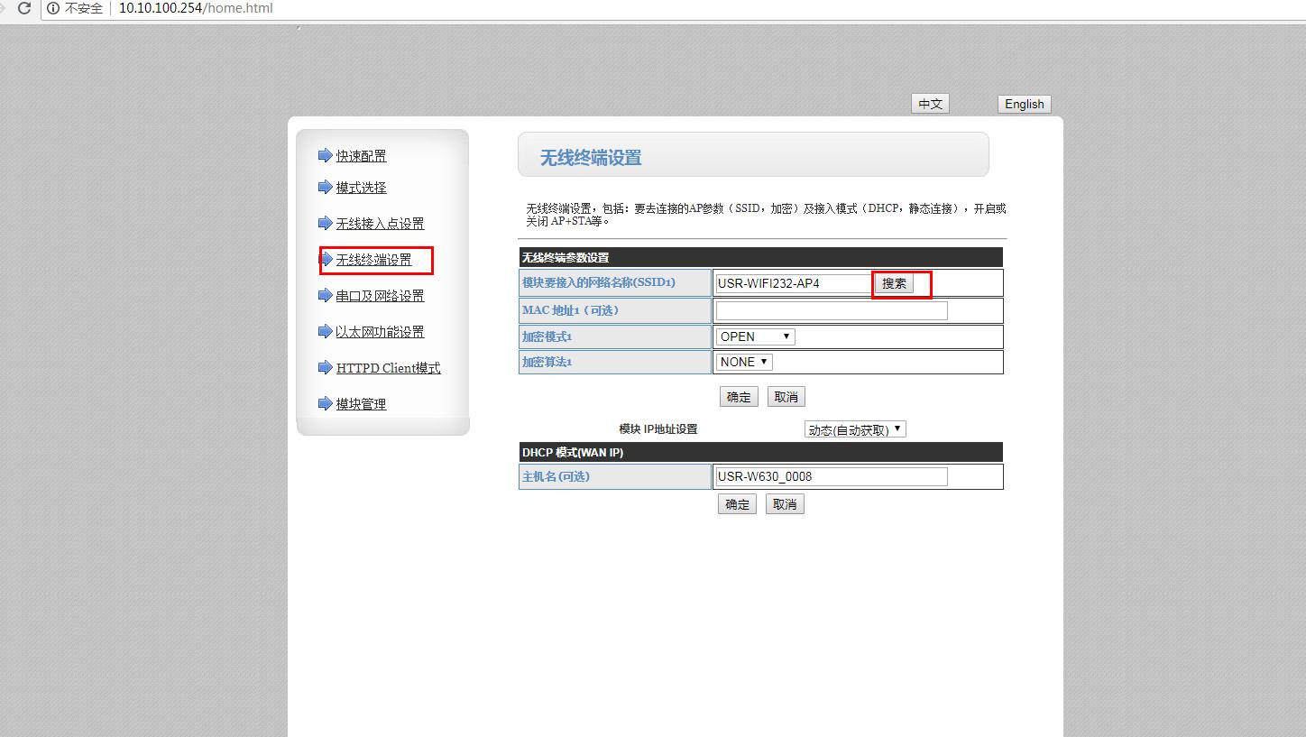 在無線終端設置中,點擊模塊要接入的網絡名稱SSID,可以手動輸入USR-W630設置STA模式要連接路由器wifi的名稱,或者點擊后面的搜索,搜索路由器的wifi。勾選,并點擊APPLY應用。跳出輸入路由器wifi密碼提示,輸入路由器的wifi密碼。點擊確定。