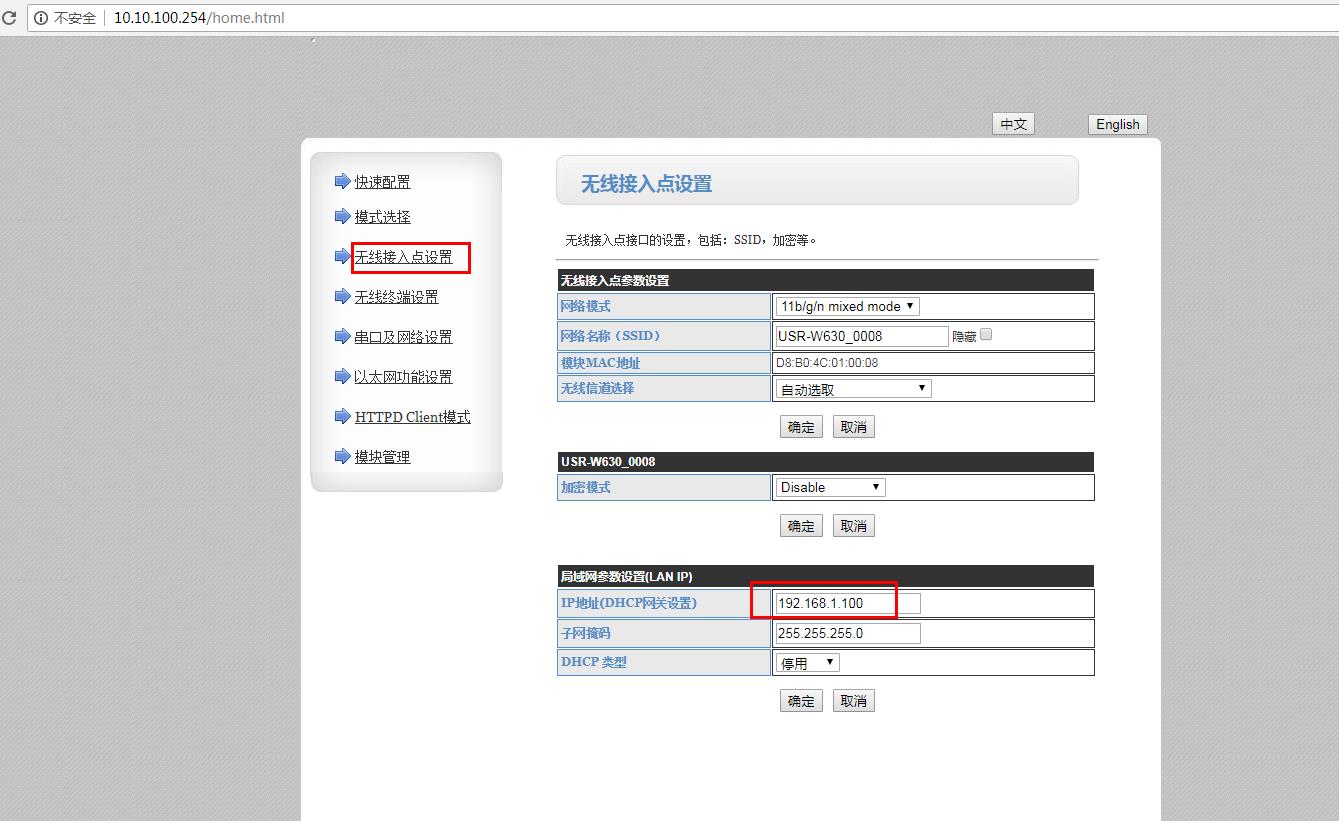 2、在無線接入點設置,局域網參數(shù)設置默認是10.10.10.254,需要修改為和USR-W630所連接路由器LAN IP同網端的IP。