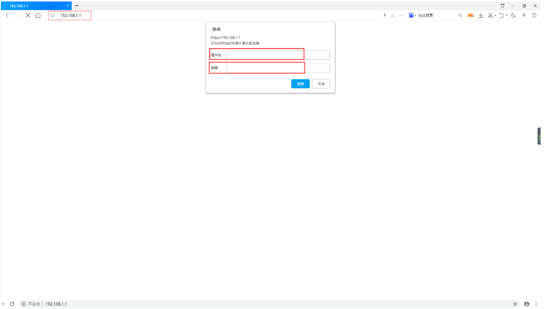 ②打開瀏覽器,在地址欄輸入192.168.1.1后回車,彈出登錄界面,填寫用戶名密碼(出廠默認都是admin)點擊確認,即可進入配置網(wǎng)頁。