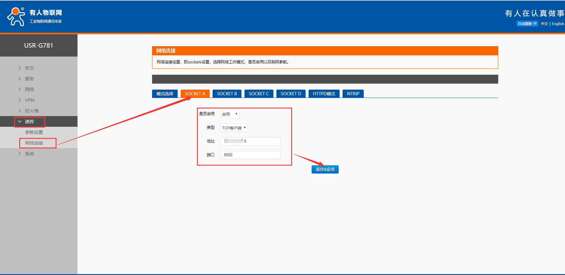 (2)透傳——網(wǎng)絡(luò)連接——SOCKETA——啟用——設(shè)置IP和端口——保存應(yīng)用