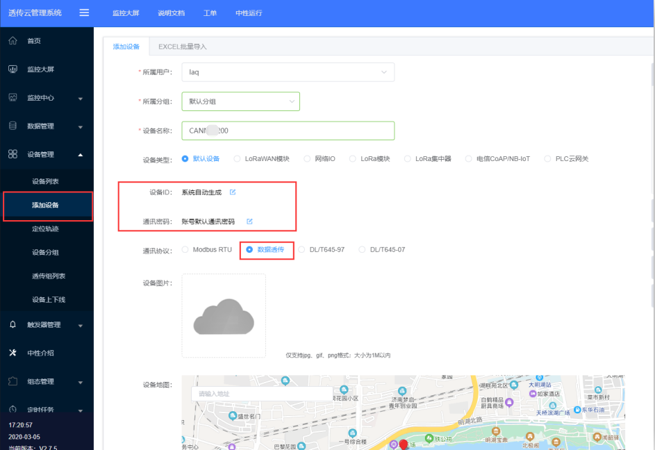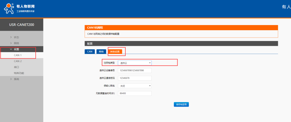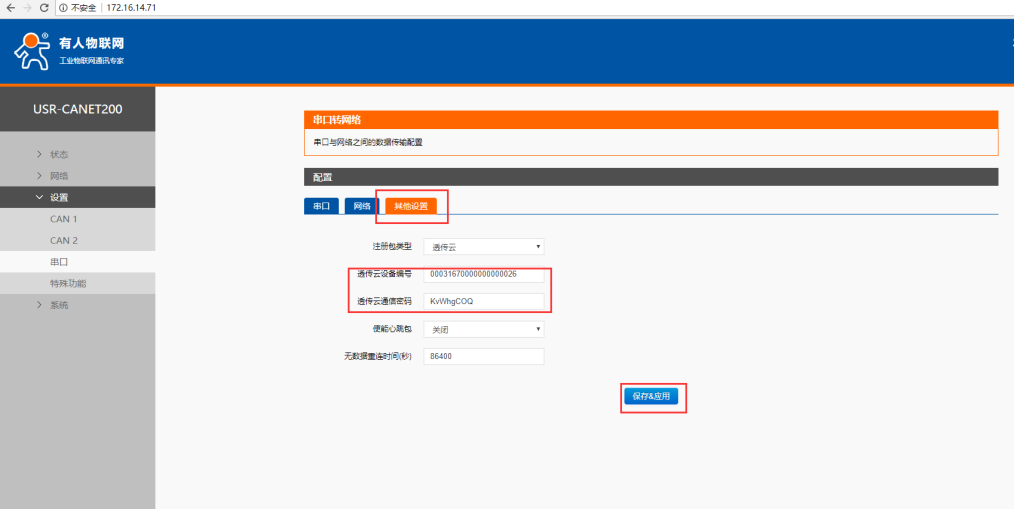 在其他設(shè)置中勾選透?jìng)髟?,設(shè)備編號(hào)與通訊密碼進(jìn)入有人云設(shè)備列表查看按鈕中查看設(shè)備SN與通訊密碼,填寫(xiě)至內(nèi)置網(wǎng)頁(yè)。