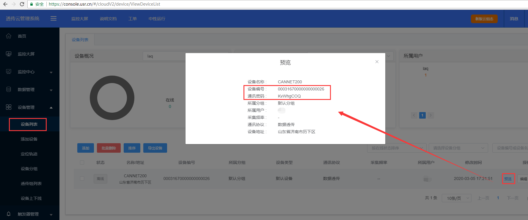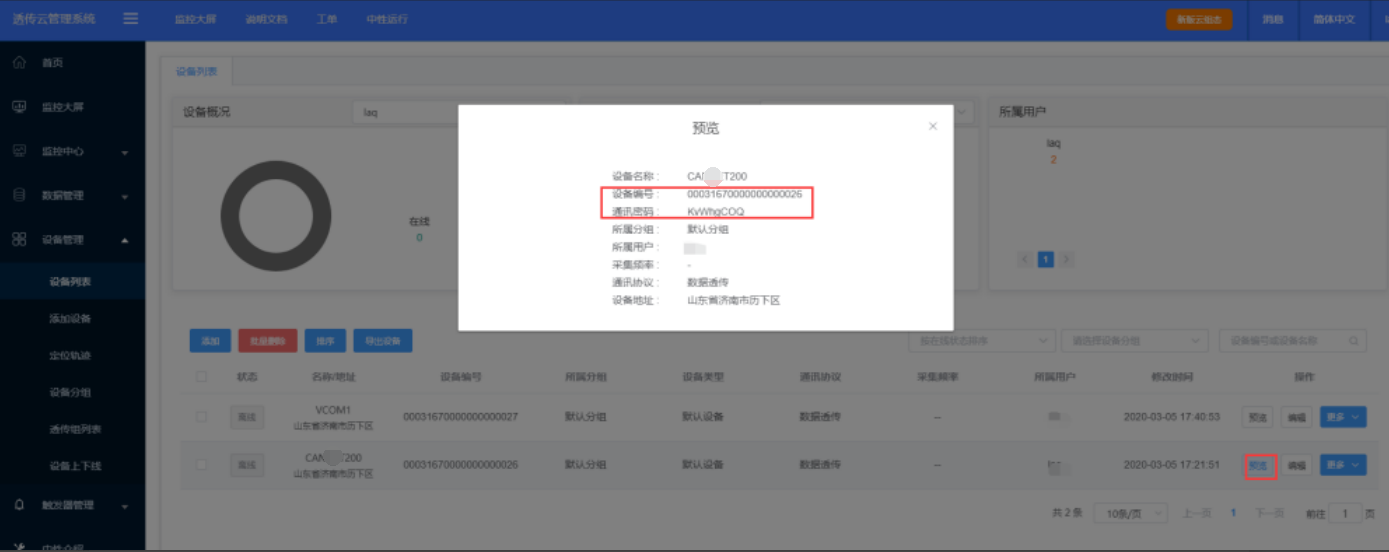3. 進(jìn)入設(shè)備列表——預(yù)覽——查看設(shè)備編號(hào)與通訊密碼。