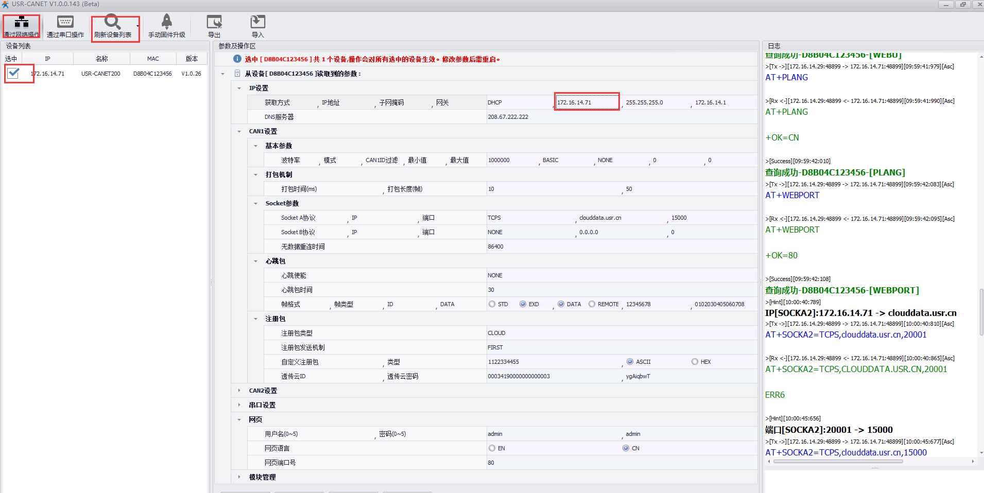 先通過(guò)端子給CANET200供電(5-36V),設(shè)備通過(guò)485轉(zhuǎn)USB串口線與PC相連接。配置前提為要將設(shè)備保持和PC在同一網(wǎng)段下,這里我們將設(shè)備與PC通過(guò)網(wǎng)線連接同一路由器,進(jìn)行測(cè)試。