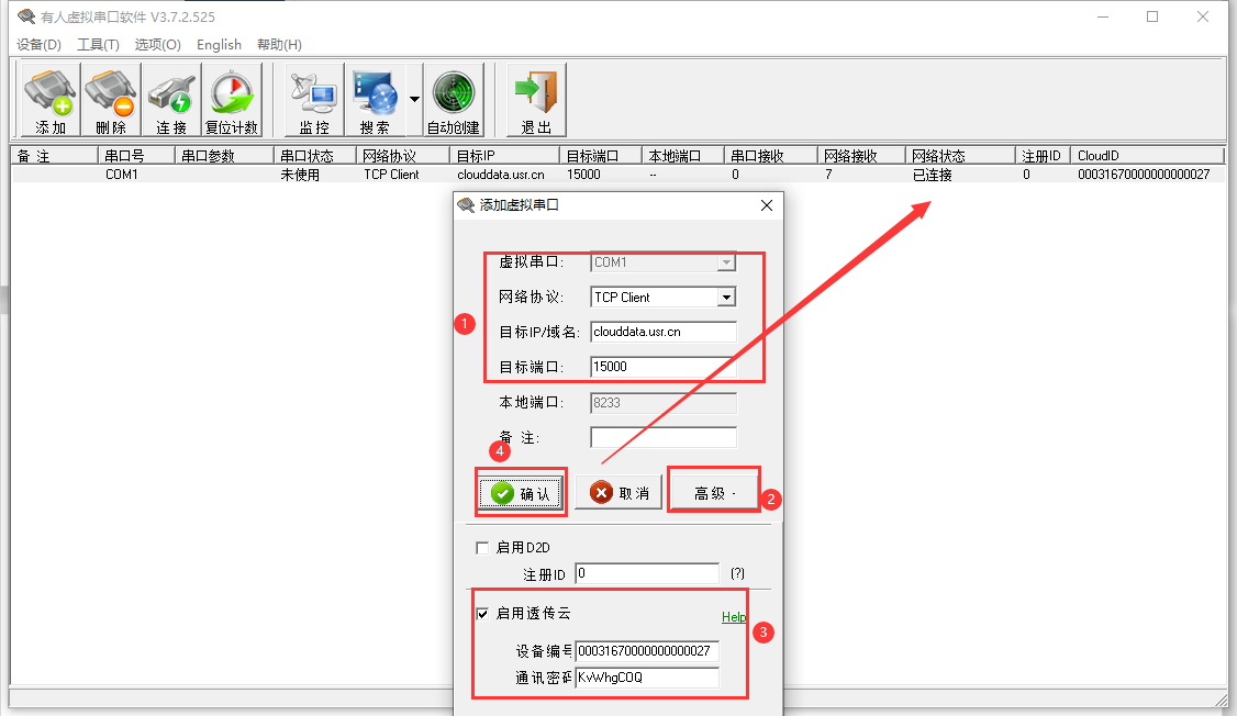 9.通過(guò)虛擬串口軟件,使虛擬設(shè)備在透?jìng)髟浦猩暇€。端口要選擇一個(gè)未被占用的端口,連接目標(biāo)IP與端口:clouddata.usr.cn,15000,在高級(jí)中啟用透?jìng)髟?,將設(shè)備編號(hào)與通訊密碼填寫(xiě)入,點(diǎn)擊確認(rèn)。