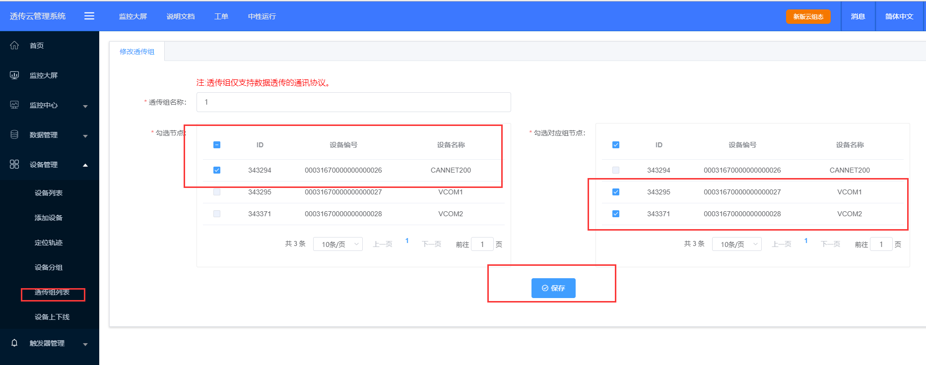 9. 當(dāng)三個(gè)設(shè)備上線之后,進(jìn)入設(shè)備管理——透?jìng)鹘M列表,建立透?jìng)鹘M。