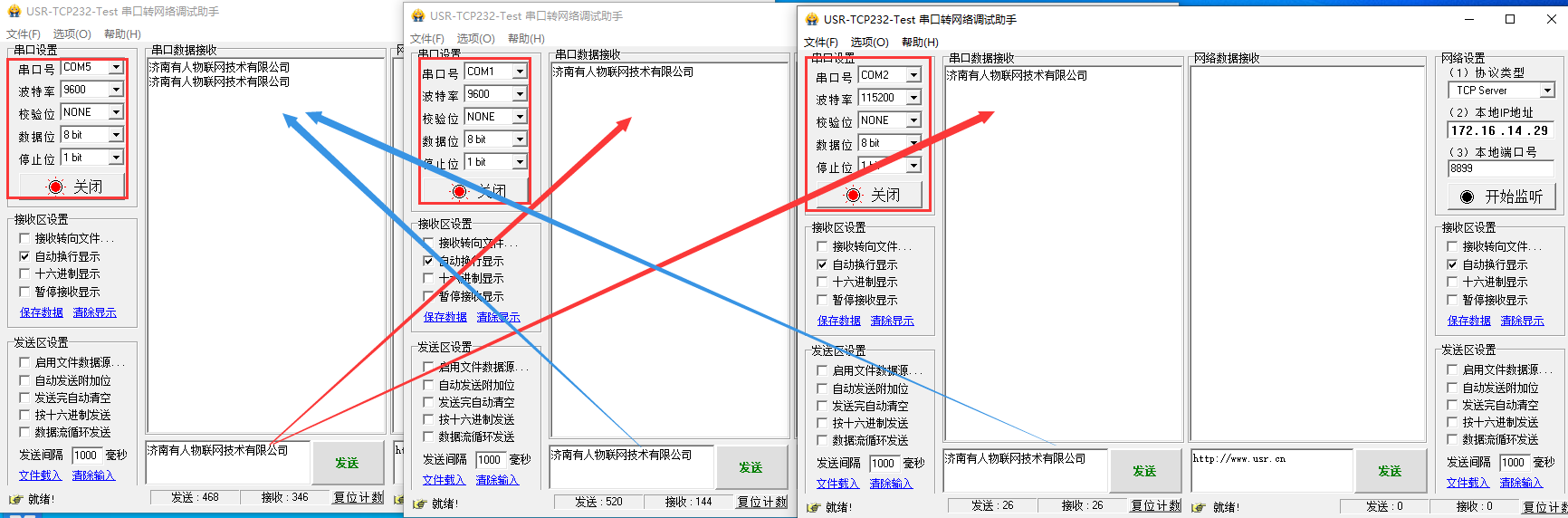 10.完成透?jìng)鹘M建立后,打開(kāi)三個(gè)串口調(diào)試助手,兩個(gè)調(diào)試助手串口端連接虛擬串口,一個(gè)調(diào)試助手串口端連接CANNET200,使三串口參數(shù)相同,即可實(shí)現(xiàn)一對(duì)多的透?jìng)鳒y(cè)試。