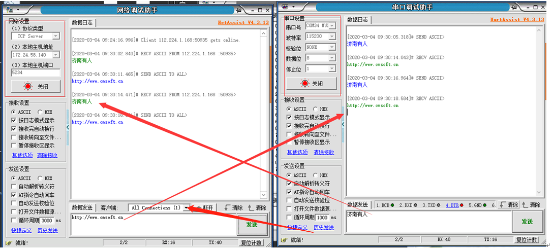 6. 打開串口,串口參數(shù)和306的串口參數(shù)保持一致,網(wǎng)絡(luò)端點(diǎn)擊鏈接,如下圖有連接對象顯示,網(wǎng)絡(luò)端和串口端互發(fā)數(shù)據(jù)測試