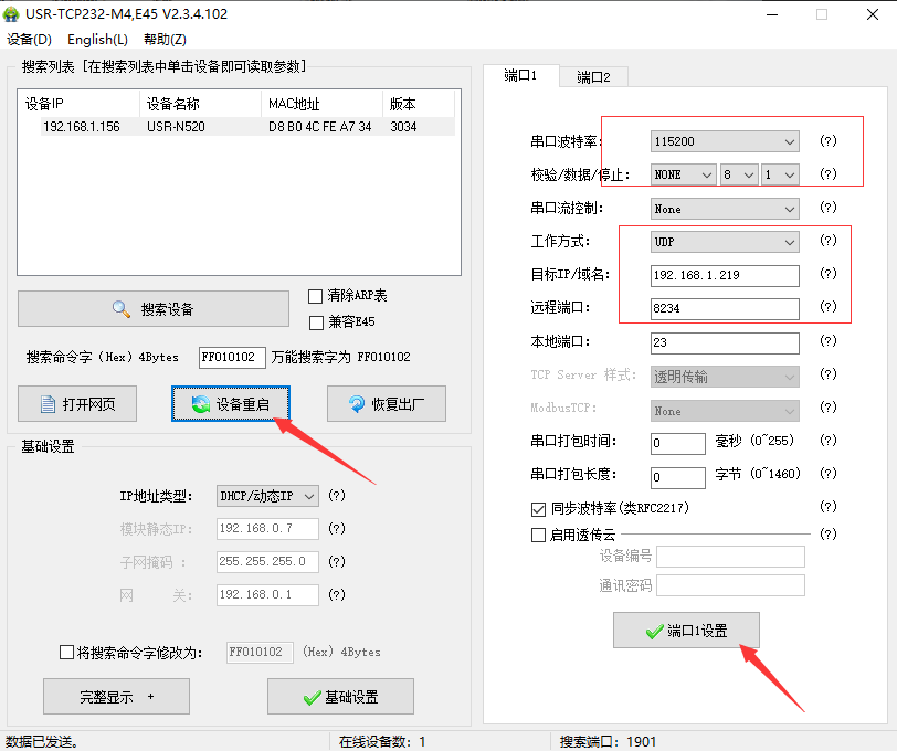 4. 更改IP地址類型為DHCP/動態(tài)IP,點擊基礎設置保存參數(shù),工作方式選擇UDP,目標IP:192.168.1.219(路由器分配給電腦的IP),遠程端口號:8234,設置完成后點擊端口1設置保存參數(shù),設備重啟使參數(shù)生效。