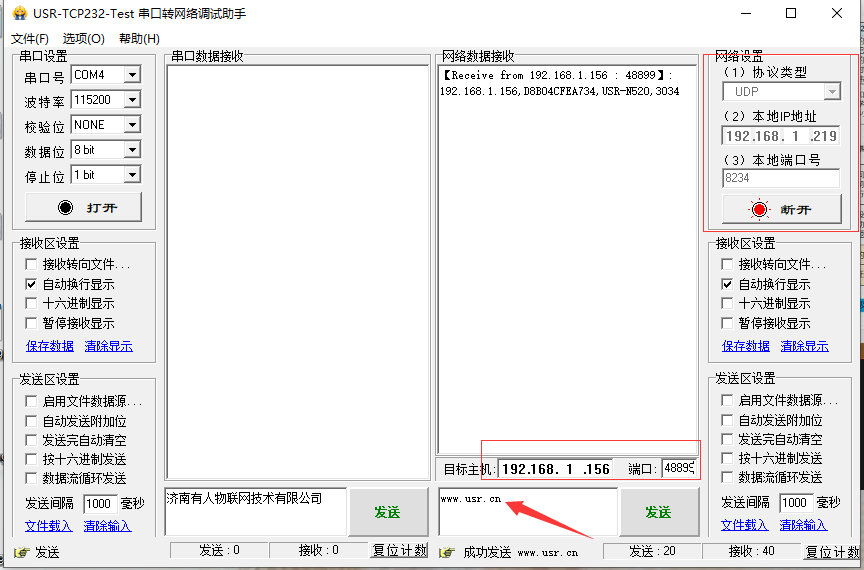 6. 打開串口調試助手,網(wǎng)絡設置為UDP協(xié)議類型,本地IP為192.168.1.219,本地端口:8234,點擊連接,更改目標主機IP:255.255.255.255,端口:48899,通過廣播的方式發(fā)送搜索關鍵字www.lifj.com.cn(區(qū)分大小寫)