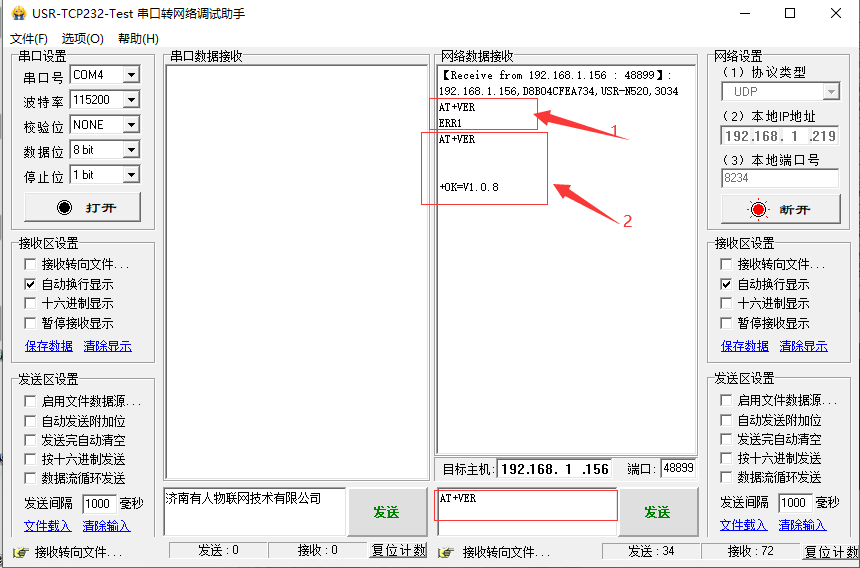 8. 查詢參數(shù):根據(jù)AT指令集發(fā)送標準AT指令,AT+VER查詢版本號,(AT指令后加回車換行),AT指令格式不正確,即返回ERR,AT+UART1查詢串口參數(shù)