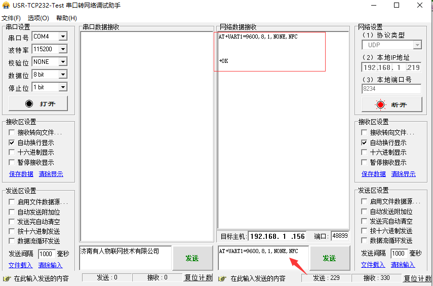 9. 修改參數(shù):按照AT指令的格式,發(fā)送正確的AT指令設置參數(shù),AT+UART1=9600,8,1,NONE,NFC返回OK后表示設置成功,可以再次查詢,可看到串口參數(shù)已經(jīng)改變