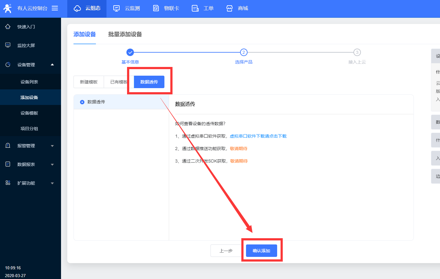 3、選擇協(xié)議這里,選擇“數(shù)據(jù)透傳”后確認(rèn)添加