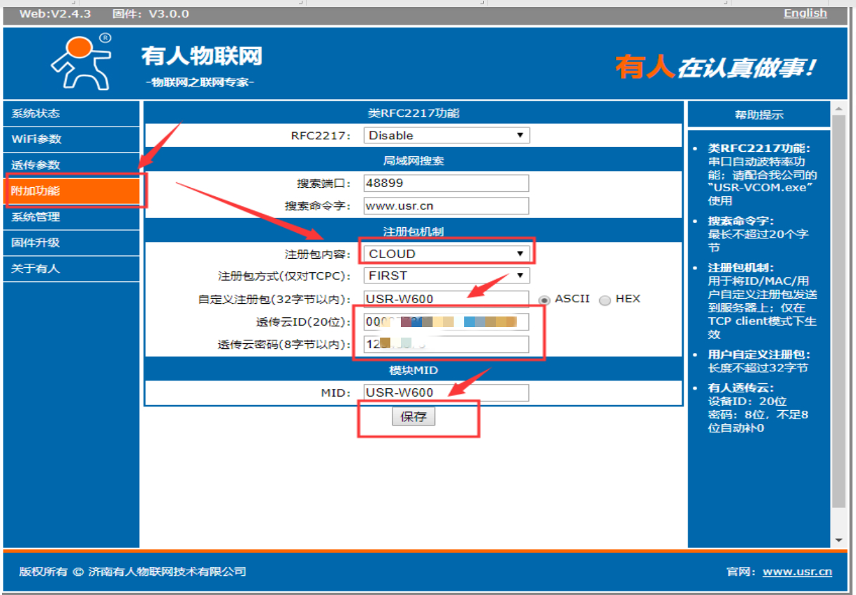 3、進(jìn)入附加功能,注冊包內(nèi)容:cloud,填上剛才在有人云上新添加的設(shè)備的編號,和密碼,點擊保存