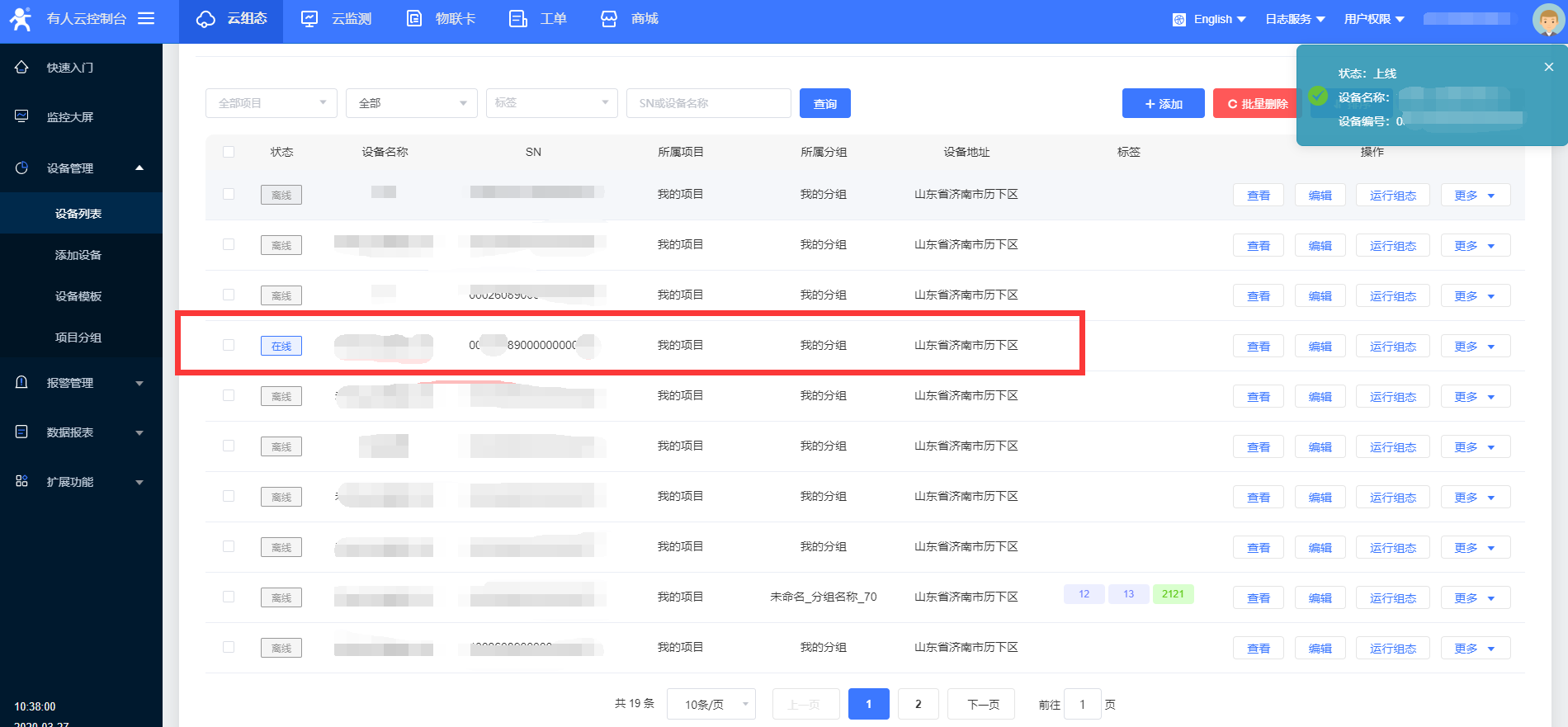 4、在設(shè)備管理》設(shè)備列表 可以看到添加的設(shè)備,點擊后面的查看,可以看到設(shè)備生成的編號及通訊密碼