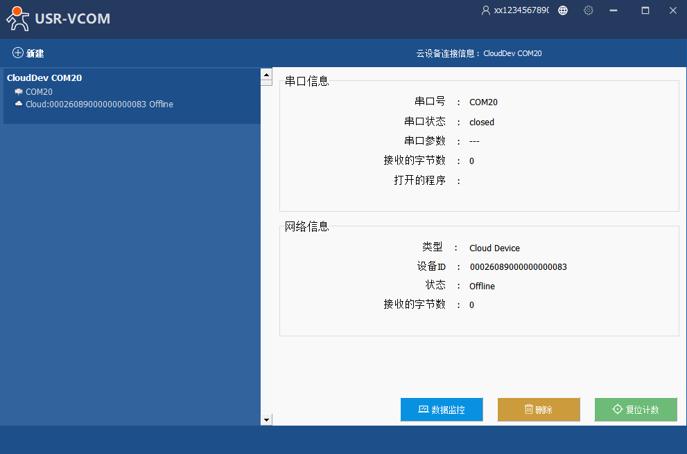 3、選擇一個不常用的串口號,選擇云端剛才添加的設(shè)備,點新建,生成設(shè)備對應(yīng)的虛擬串口