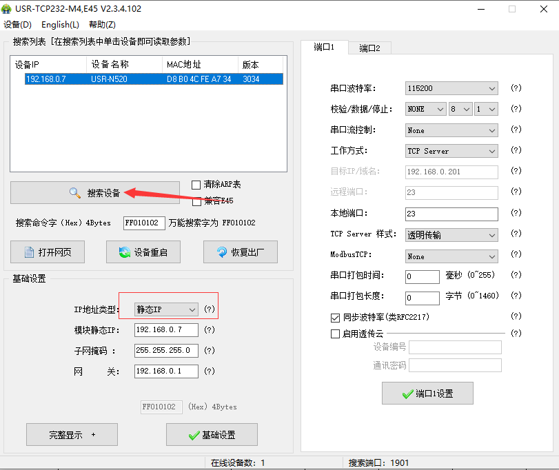 4.修改服務器地址和端口--->端口1設置--->設備重啟。這里填寫的為我自己服務器的ip,端口為臨時創(chuàng)建的端口,用戶在使用時不可以依照次ip與端口來進行配置,需要連接自己服務器的ip與端口。