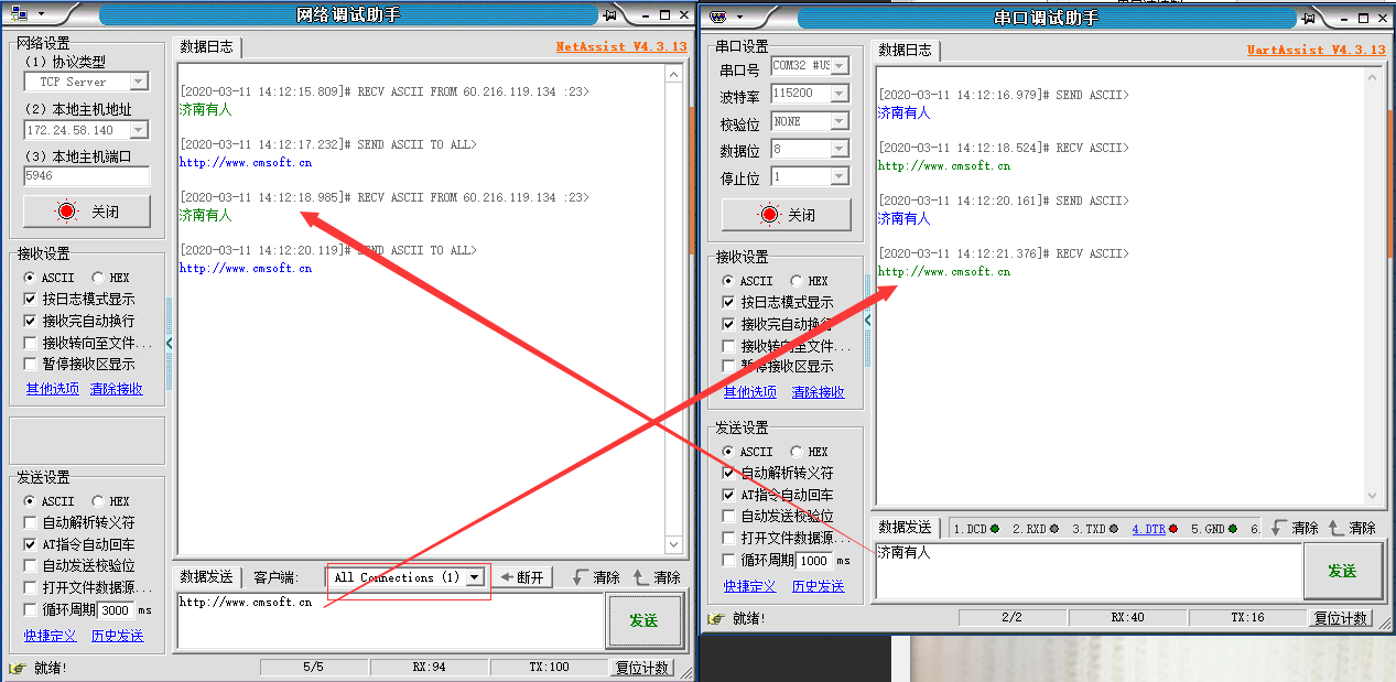 3.重啟后進行通信測試,測試結果如下圖所示??梢钥吹綌祿瞻l(fā)都是正常的。