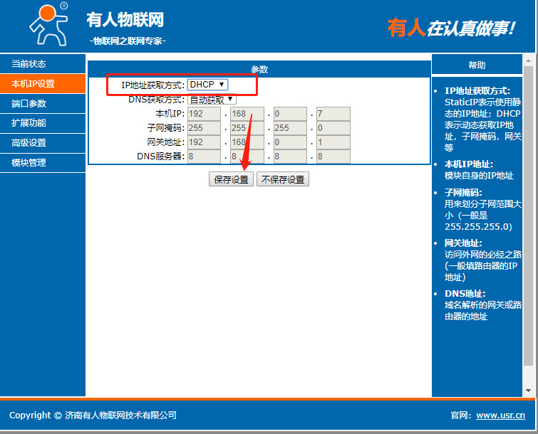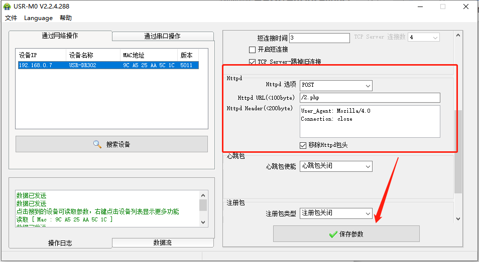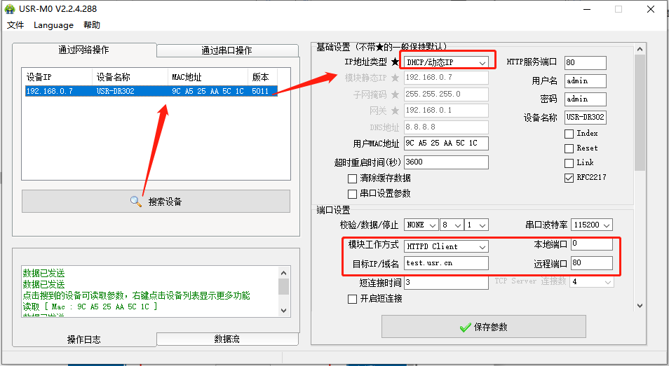 點擊“搜索設(shè)備”當搜索列表中出現(xiàn)302的設(shè)備后,單擊搜索到的設(shè)備,IP設(shè)置為DHCP,模塊設(shè)置為Httpd Client模式,請求方式POST,URL為/2.php,設(shè)置服務(wù)器地址test.usr.cn,端口80,設(shè)置并保存所有參數(shù),重啟模塊。(本說明文檔使用為有人測試服務(wù)器)