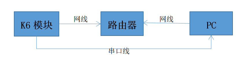 1.將 K6通過串口線(USB 轉RS232串口線)與計算機相連接,通過網(wǎng)線將 K6 的網(wǎng)口 與路由器相連接,PC也連接這個路由器,檢測硬件連接無錯誤后,接入5V電源適配器,給K7供電。觀察K6網(wǎng)口指示燈狀態(tài)是否正常:綠色燈常亮,黃色燈閃爍。