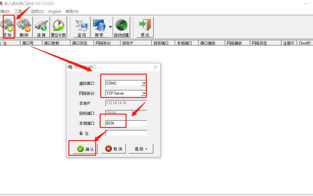 網(wǎng)絡(luò)協(xié)議選擇tcp server,本地端口設(shè)置為8234