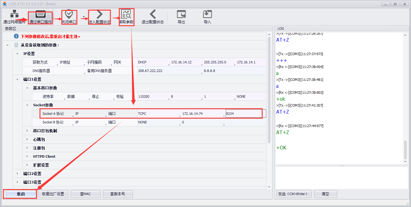 2.打開(kāi)N668設(shè)置軟件,點(diǎn)擊“通過(guò)串口操作”——“打開(kāi)串口”——“進(jìn)入配置狀態(tài)”——“讀取參數(shù)”,設(shè)置動(dòng)態(tài)獲取IP