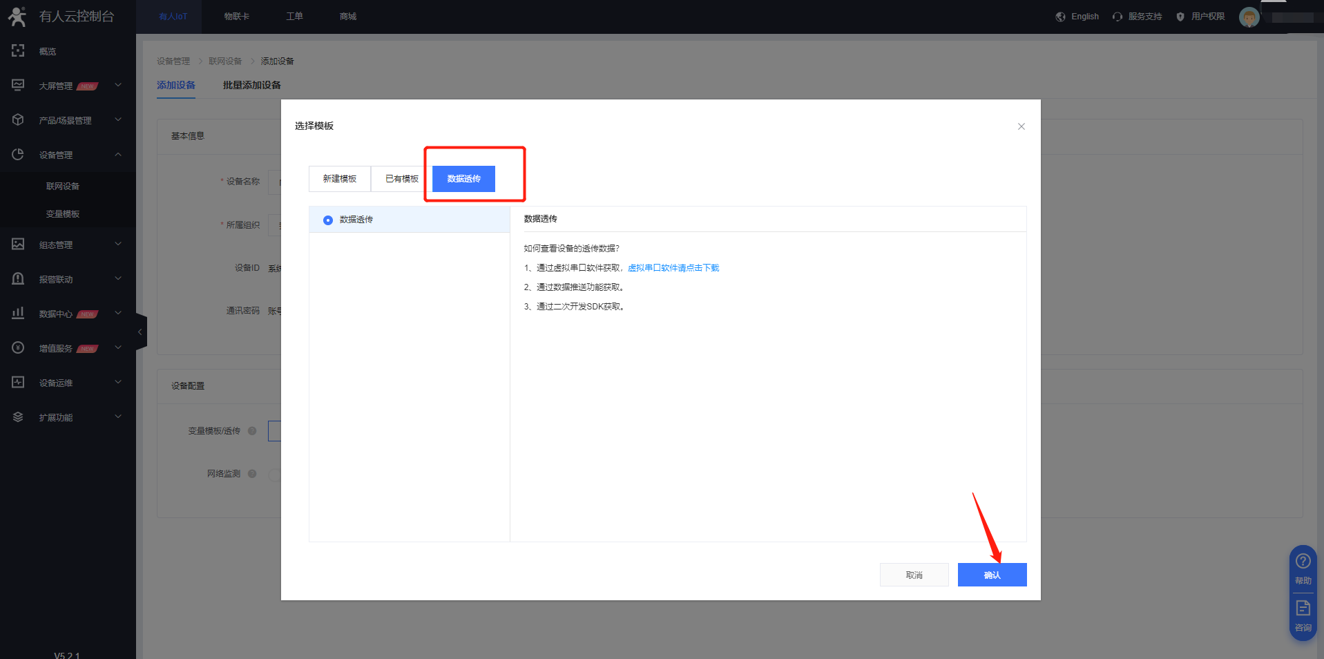 4、選擇數(shù)據(jù)透傳,確認(rèn)添加